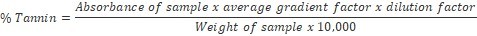 The total tannin was determined by the Spectrophotometric procedure described by Association of Official Analytical Chemists12 by measuring 0.20 g of sample into a 50 ml beaker followed by addition of 20ml of 50% methanol, covered with parafilm and placed in a water bath set between 77-800C for 1 hr and shaken thoroughly. The extract was quantitatively filtered using a double layered Whatman No 41 filter paper into a 100 ml volumetric flask. Twenty millilitres (20 ml) water was added, 2.5 ml Folin-Denis reagent and 10 ml of 17% Na2CO3 were added and mixed properly. The mixture was made up to the mark with distilled water and allowed to stand for 20 min for the bluish–green colour to develop. Standard solutions of tannic acid were prepared and treated similarly as the samples. The absorbance of the tannic acid standard solutions as well as samples were read after colour development on a spectronic21D spectrophotometer at 760 nm12. Percent tannin was calculated using the formula:
