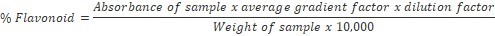 The samples were grinded, and 0.50 g of finely ground sample was weighed into a 100 ml beaker and 80 ml of 95% ethanol was added and stirred with a glass rod to prevent lumping. The mixture was filtered through a Whatman No.1 filter into a 100 ml volumetric flask and made up to mark with ethanol, and 1ml of the extract pipetted into 50 ml volumetric flask. Four drops of concentrated HCl were added, after which 0.5 g of magnesium turnings was added to develop a magenta red coloration. Standard flavonoid solutions of range 0-5 ppm were prepared and treated in a similar way with HCl and magnesium turnings like sample. The absorbance of sample and standard solutions was read on a digital Jenway V6300 Spectrophotometer at 520 nm13. The percentage flavonoid was calculated using the formula: