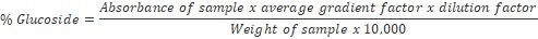 Ten millilitres of extract was pipette into a 250 ml conical flask, 50 ml of chloroform was added and shaken on a Vortex Mixer for 1 hr. The mixture was filtered, 10 ml pyridine and 2 ml of 2% sodium nitroprusside were added, shaken thoroughly for 10 mins and 3 ml of 20% NaOH added to develop a brownish yellow colour. Standard solutions of glycoside ranging from 0 – 5 mg/ml were prepared and treated as the sample. The absorbance of the sample and standard solutions was read on a Spectronic21D digital Spectrophotometer at 510 nm14. The percentage of the glucoside was calculated using the formula: