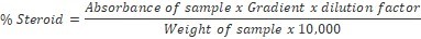 About 0.5 g of sample was weighed into 100 ml beaker and 20 ml of chloroform-methanol (2:1) mixture added and shaken for 30 min on a shaker. The mixture was filtered through a Whatman No.1filter paper and resultant residue repeatedly treated with chloroform-methanol mixture until free of steroids. One millilitre (1 ml) of the filtrate was pipetted into a 30 ml test tube and 5 ml of alcoholic KOH added and shaken thoroughly. The mixture was later placed in a water bath set at 370C - 400C for 90 mins, cooled to room temperature, then 10 ml of petroleum ether added, followed by addition of 5 ml distilled water. The solution was evaporated to dryness on the water bath and 6 ml of Liebermann Burchard reagent was added to the residue in dry bottle and absorbance taken at 620 nm on a Spectronic21D digital Spectrophotometer. Standard steroid solutions of 0–4 mg/ml concentration were prepared and treated like sample14,15,16. The percentage steroid was calculated using the formula: