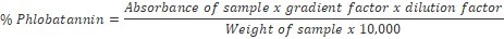 The method of Analytical methods committee of the Royal Society of Chemistry14 was employed. About 0.5 g of sample was weighed into 50 ml beaker, 20 ml of 50% methanol was added and covered with parafilm and placed in a water bath set at 77 – 800C for 1 hr. The mixture was properly shaken and then filtered through a Whatman No 1 Filter paper into a 50ml volumetric flask using aqueous methanol to rinse and make up to mark with distilled water. To 1 ml of the solution pipetted into a 50 ml volumetric flask, were added 20 ml water, 2.5 ml Folin-Dennis reagent, and 10 ml of 17% sodium carbonate. This mixture was homogenized thoroughly for 20 mins. Standard Phlobatannin solutions of 0-5 mg/ml concentrations were prepared and treated as the sample above. The absorbance of standard solutions and the sample was read at 550 nm on a Spectronic21D Spectrophotometer. Percent Phlobatannin was calculated using the formula: