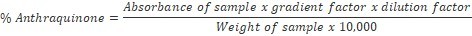 About 0.50 g of sample was weighed into 250 ml beaker and 60 ml benzene added and stirred and filtered using Whatman No.1 filter paper. About 10 ml of filtrate was pipetted into another 100 ml volumetric flask and 0.2% Zinc dust was added followed by the addition of 50 ml hot 5% NaOH solution. The mixture was heated just below boiling point for 5 mins and then rapidly filtered and washed once in water. The filtrate was again heated with another 50 ml of 5% NaOH to develop a red colour. Standard anthraquinone solutions of range 0-5 mg/l were prepared and treated with 0.2% Zinc dust and NaOH as the sample. The absorbance of sample as well as that of standard solutions were read on a digital spectrophotometer at 640 nm14. The percentage anthraquinone was calculated using the formula: