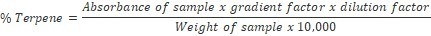 About 0.50g of sample was weighed into a 50 ml conical flask, 20 ml of 2:1 chloroform-methanol mixture was added, thoroughly agitated and allowed to stand for 15 mins. The mixture was later centrifuged for another 15 mins. The supernatant solution obtained was discarded and the precipitate re-washed with another 20 ml chloroform-methanol mixture for re-centrifugation. The resultant precipitate was dissolved in 40 ml of 10% sodium dodecyl sulphate solution, 1 ml of 0.01 M ferric chloride solution added at 30 s interval, shaken well and allowed to stand for 30 mins. Standard terpene solutions of concentrations 0 – 5mg/ml were prepared from stock solution (Sigma-Aldrich chemicals U.S.A). The absorbance of sample as well as the standard solutions of terpenes were read on a digital spectrophotometer at 510 nm14. The percentage terpene was calculated using the formula: