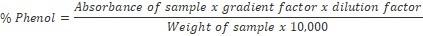 About 0.20 g of sample was weighed into a 50 ml beaker, 20 ml of acetone added and homogenized for 1hr and filtered through a Whatman No.1 filter paper into a 100 ml volumetric flask using acetone to rinse, and made up to the mark with distilled water. One millilitre of sample extract was pipetted into 50 ml volumetric flask, 20 ml water added, 3 ml of phosphomolybdic acid added, followed by the addition of 5 ml of 23% Na2CO3 mixed thoroughly, made up to mark with distilled water and allowed to stand for 10 mins to develop bluish-green colour. Standard solutions of phenol of 0-10 mg/ml was prepared from stock solution (Sigma-Aldrich chemicals U.S.A). The absorbance of sample and the standard solutions of phenol were read on a digital spectrophotometer at 510 nm14. The percentage Phenol is calculated using the formula: