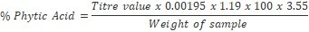 About 2 g of each sample was weighed into 250 ml conical flask, 100 ml of 2% hydrochloric acid was added, soaked for 3 hrs, filtered through a double layer of hardened filter paper and 50 ml of each filtrate placed in 250 ml conical flask and 107 ml distilled water added. About 10 ml of 0.3% ammonium thiocyanate (NH4SCN) solution was added to each solution and titrated with 0.00195g/ml iron (III) chloride solution to a slightly brownish-yellow end point which persisted for 5 mins12. The percentage phytic acid was calculated using the formula:
