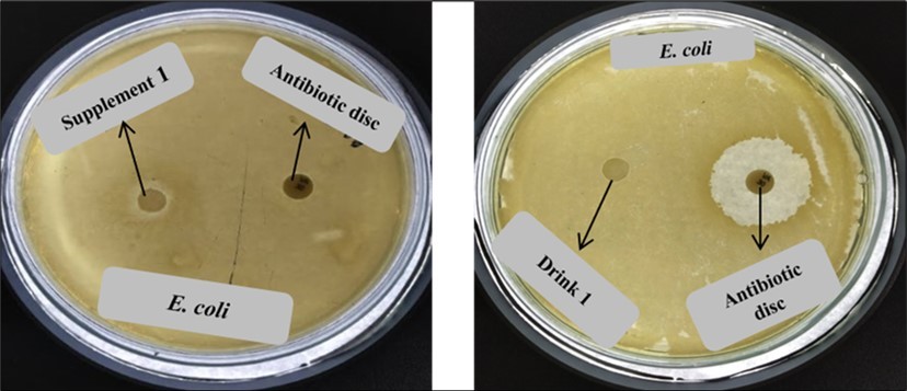 In the case of five probiotic supplements, four were labeled with their respective Lactobacillus strain and colony as per IPA guidelines. However, supplement 5 didn’t follow any of it. Probiotic bacteria need to be alive and present in large quantities to provide health benefits; this concentration is typically 106–107 cfu/g of the product 25. In the stated labeling they claimed that the probiotic supplements contained 4×109billion colonies of different strains of Lactobacillus. But the research showed that supplements contain fewer colonies than 4×109which were stated in the labeling. In the case of probiotic drinks, drink 1 was a better probiotic than others although its antimicrobial activity against E. coli was not satisfactory. Here, the Lactobacillus strain was specifically labeled and the viable cell number mentioned in the labeling was 6.54 × 106billion. But probiotic drinks 2, 3, and 4 were not labeled with respective strains and colony numbers. The colony number was less than 4×109billion as shown in Table 1 above.