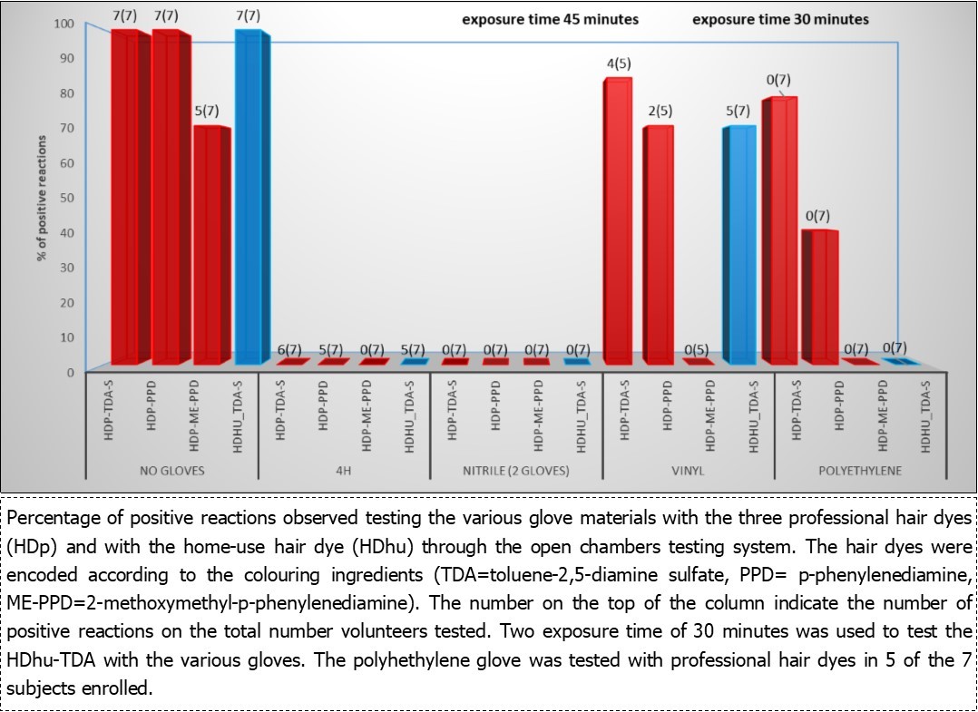 Comparing the protection offered by the polyvinyl chloride gloves when using the different professional hair dyes, these gloves did not have a good performance since 5 and 6 of 7 subjects reacted when tested with the HDp-PPD and with HDp-TDA-S respectively, and 5 of 7 subjects reacted at 30 minutes of exposure with HDhu-TDA-S.