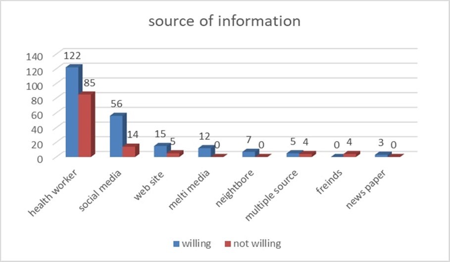 Two hundred and seven study participants got COVID-19 vaccine related information’s from health care workers, out of them about 85 study participants had willingness to accept COVID-19 vaccination (Figure 1).
