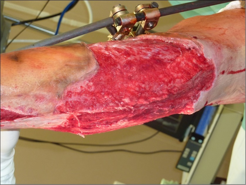 Our Acute Surgery methods are complete limb debritman, excision of necrotic parts of skin, subcutis, removal of other microscopic impurities. Than stabilization of the tibia OS by external fixation. Reconstruction of soft structures, muscles, fascias, subcutis and skin. Application of Synthetic Skin Cover /Synkryt / or NPWT immediately. Limb wound dressing for vacuum therapy is every 4-5 days.