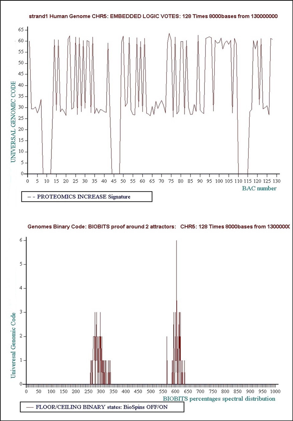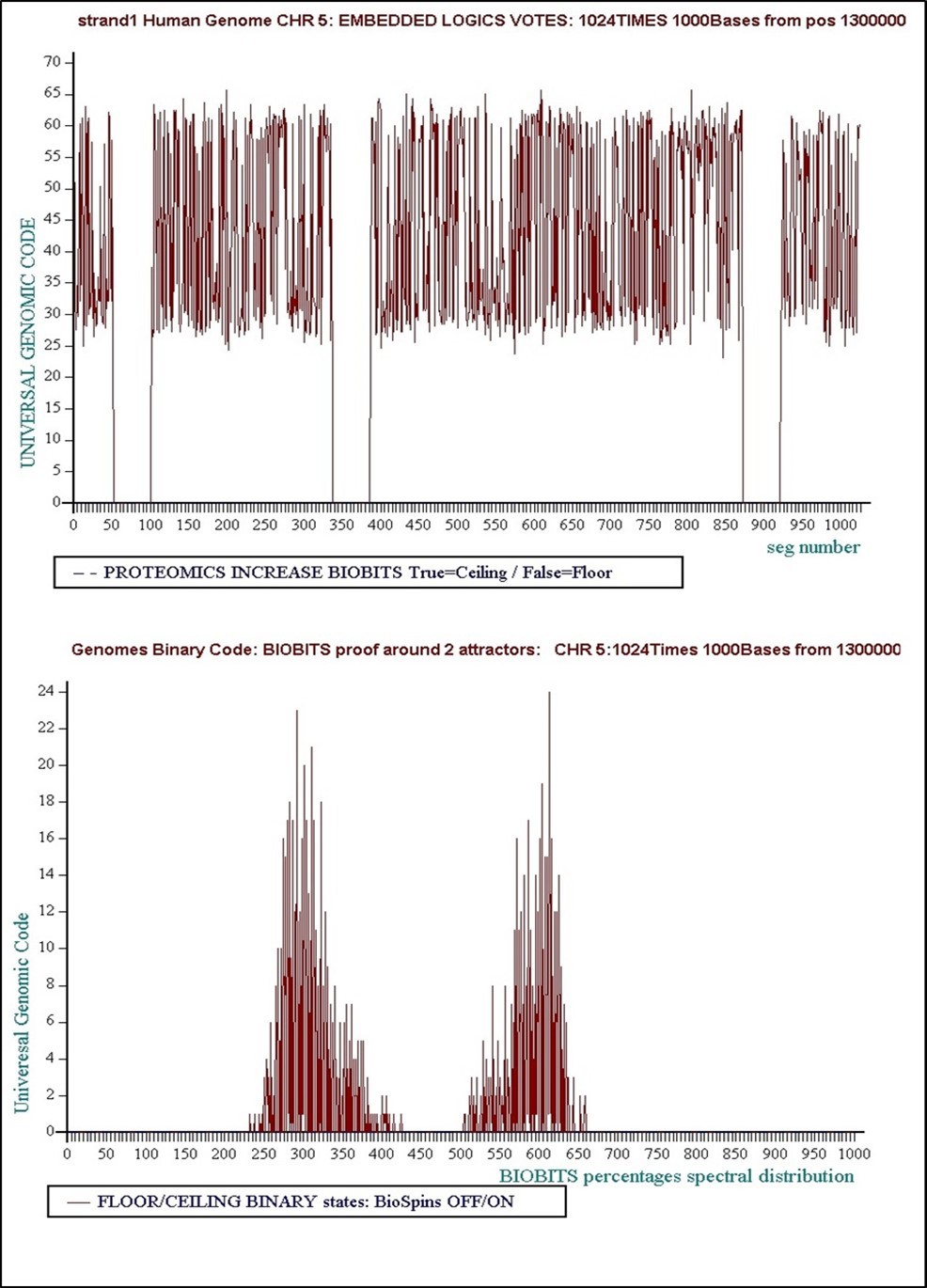 In this paper, the analysis of the genetic information (proteomic image) of the entire human genome highlights a binary modulation (Figure 15 and Figure 16) throughout the genome.This binary modulation is distributed statistically around 2 binary attractors whose ratio is equal to TWO and whose respective values are phi (level "high" = 1) and phi / 2 (level "low" = 0) With phi = 0.618 ... = 1 / Phi the Golden ratio (Phi = 1.618. ..).