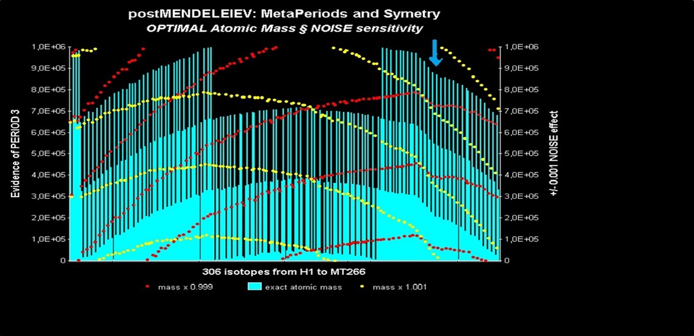 The law of numerical projection atomic mass code (-I-) behaves like a kind of ideal law, objective in the sense defined by Jacques Monod 13. Because it is optimal for the average atomic masses of bioatoms, it is inaccessible in the real universe which is only individual isotopes. Thus this law, if the nature of the living "seeks" to approach it in search of better equilibrium and stability, will compel to seek more DIVERSITY. Diversity of isotopes of the same atom, diversity of isotope changes over time. We can make an analogy with the electron layers of atoms: they are only densities of probability, an individual electron only reaching by chance this ideal value. Here it is the same: this optimal ideal code for the average atomic mass that never exists in the real world of isotopes will force them to diversify and self-organize for more stability ... as if the forced plan of evolution towards more complexity (molecules, RNA, DNA, amino acids) was already a necessity, an implication, in the sense dear to Nobel prizewinner Jacques Monod.
