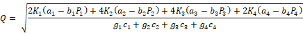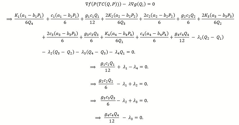 By applying Kuhn Tucker conditions, the total cost is minimized by finding the solution of Q1, Q2, Q3, Q4 with Q1, Q2, Q3, Q4