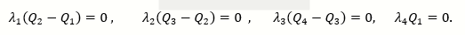 𝞴1Q1 = 0 arrive at 𝞴4 = 0 In a similar fashion, if 𝞴1= 𝞴2 = 𝞴3 = 0, Q4 ≤ Q3 ≤ Q2 ≤ Q1 does not satisfy 0 ≤ Q1 ≤ Q2 ≤ Q3 ≤ Q4. Therefore the conclusion is Q2 = Q1, Q3 = Q2 and Q4 = Q3