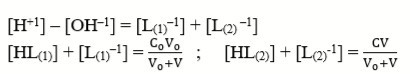 Identical formula is obtained for reverse titration, HL (C0,V) ⇨ HB (C,V0), where V0 of C mol/L HB is titrated with V mL of C0 mol/L HL. From Eq, 2 and [B-1] = CV0/(V0+V) , HL + [L-1] = C0V/(V0+V), we get, by turns,