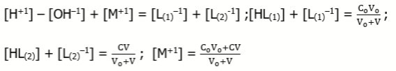 α = [H+1] – [OH-1] = [H+1] – KW/[H+1] = 10-pH – 10pH-14, δ = [L-1]/([HL] + [L-1]) = K1/(K1 + [H+1]), KW = [H+1][OH-1],