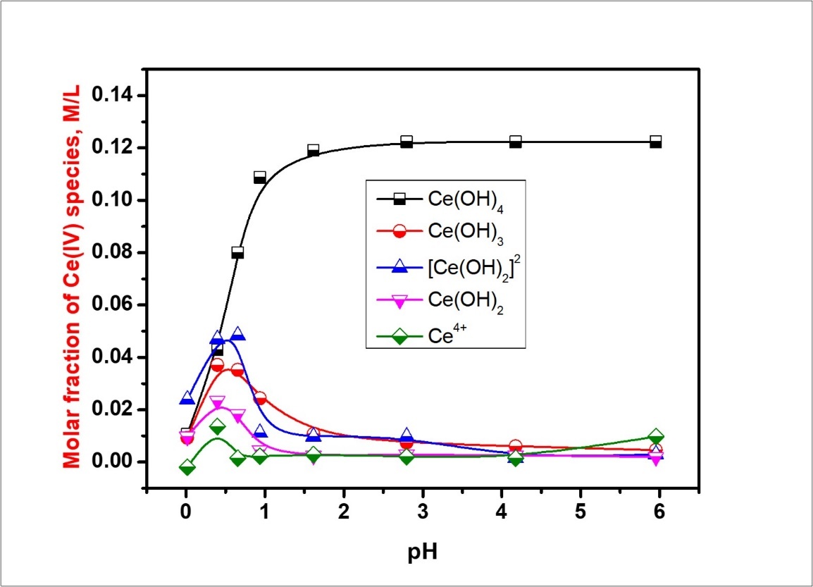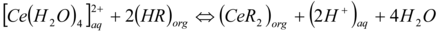 Where HR that the Di-(2-ethylhexyl) phosphoric acid extractant and the aq. and org. denotes aqueous and organic phase conditions respectively. At pH>2.0 the precipitate formation of Ce(OH)2 tends to diminished the efficiency, Ce(IV) aqueous concentration decreasing the Cerium extraction.