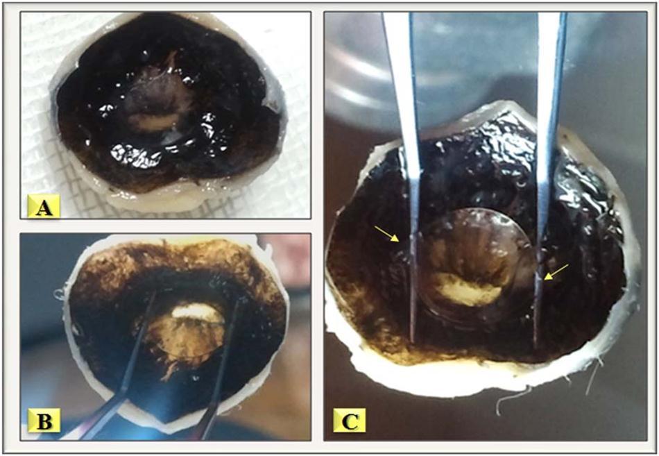 Alpha chymotrypsin vial was prepared and diluted 1:1 with saline. Alpha chymotrypsin was injected into the posterior chamber of the eye to induce further zonulysis. The solution was injected with slight force so that the iris ballooned forward, and after three minutes, the anterior chamber was irrigated with 10 ml of ringer’s solution. Extension of the corneal incision was performed with corneal scissors from a 2 o'clock to 10 o'clock positions. The lens was removed within its capsule by applying pressure at the 6 o'clock position with a muscle hook and pressure at the 12 o'clock position, and the eye was left without any capsular support.5