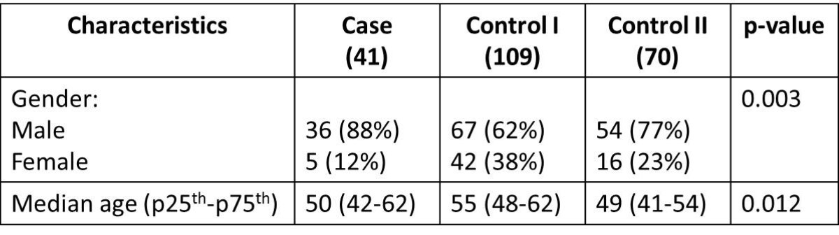 In the study 63 females and 157 males were enrolled. There is a statistically significant difference in the gender composition between the three groups (p < 0.01).
