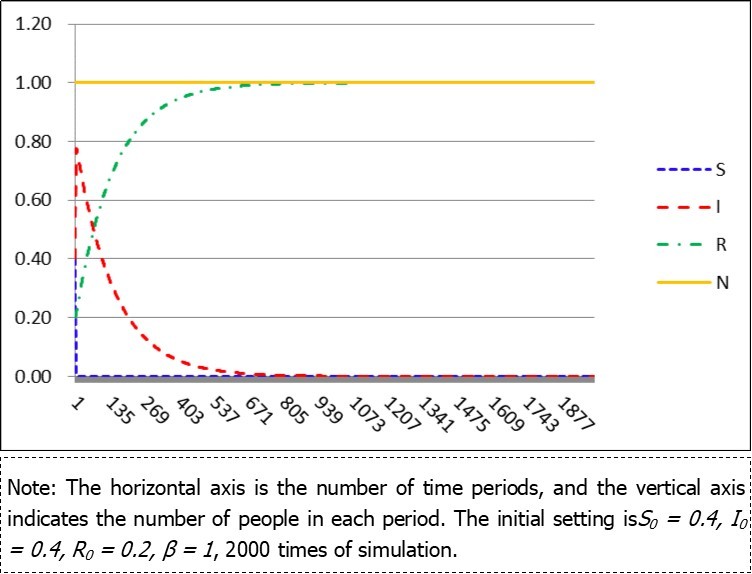 The initial setting are S0 = 0.4, I0 = 0.4, R0 = 0.2, Nt = 1, β = 1. Notice that Nt = 1 means the total population is standard to be 1 and unchanged, while β = 1 represents that the infected people will effective contact with all other person in the area.