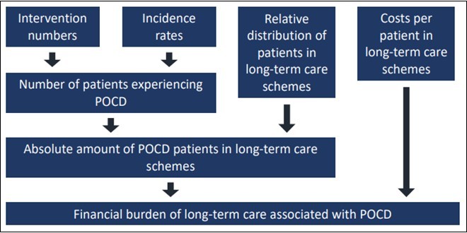 The assessment of long-term care intensity within the German nursing care insurance is a complex process, accounting for various factors such as mobility, cognitive abilities, psychological problems, self-reliance, dealing with disease-specific challenges, aspects of everyday life and social contacts. During the assessment a patient is assigned to different amount of points in each of the aforementioned domains by an independent assessor. According to the total amount of points, a patient is then assigned to long-term care intensity 1 to 5 (Pflegegrad 1 to 5). Due to a lack of published studies on the long-term care dependency resulting from POCD within the framework of Pflegegrade (legally introduced in 2017), we implemented the assumption that a new POCD case will transition from long-term care intensity 0 (no dependency on care-giving) to long-term care intensity 2 (Pflegegrad 2), which represents a low level of dependency on care-giving. This assumption is in line with the fact, that patients who were grouped into degree 0 or 1 (Pflegestufe 0 and 1) according to the former long-term care intensity definition before 2017 (Pflegestufen), would today be grouped into intensity 2 (Pflegegrad 2).