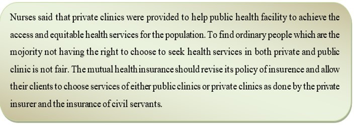 During the interview, people living in Kigali said that dental therapy is a service that is needed to be added to the services offered at health center and staffs should be increased because a patient spend much time at public health centers waiting the service. They desire public mutual health insurance to work with private clinics and pharmacies.