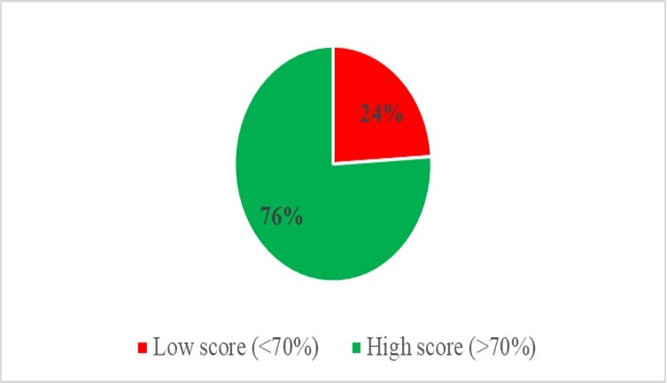 Nineteen (19) questions related to the knowledge towards CVDs were appraised by using SPSS score assessment and the score was one score for a correct answer and zero for false answer. An overall knowledge score was calculated by adding up the scores for each respondent across all 19 questions. Findings in Figure 1 specify that 76% of respondents had a high level of knowledge towards CVDs whereas 24% had shown a low level of knowledge towards CVDs. The mean knowledge score for all participants was found to be 14.2 (SD = 1.6). The minimum score was 9.9 scores and the maximum score was 19 scores.