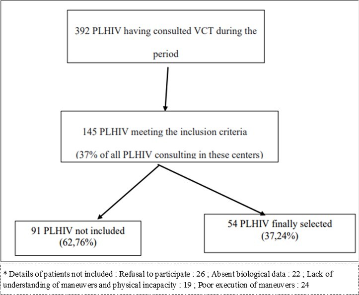 This was a descriptive and analytical retro-prospective cross-sectional study, conducted in the voluntary counselling and testing (VCT) centres, specialized in monitoring PLHIV and supplying them with ART in the pulmonology units of the Cocody and Treichville University Hospital Centres in the district of Abidjan, from March 15 to June 15, 2022. This study concerned PLHIV aged at least 18 years, received in the VCT centres of one of the centres mentioned for the medical follow-up of HIV infection, presenting no acute respiratory or general symptoms (dyspnoea, cough, fever ≤ 3 weeks), no contraindication to performing spirometry according to the ATS/ERS 2019 criteria 14, and having agreed to participate in the study after obtaining informed consent. Were excluded from the study, those with known asthma or COPD (Figure 1). Spirometry was performed in every person included in the study. We used as equipment a 7-inch touch screen portable turbine spirometer with an integrated printer (Spirolab New®) with the accessories (turbine, disposable mouthpiece, an antibacterial filter, nose clip and an inhalation chamber), salbutamol spray dosed at 100 µg and a pulse oximeter. When performing the test, acceptability and repeatability criteria of the parameters were applied according to the ATS/ERS recommendations 14. The reference values were those of the African-American population, taken from the Global Lung Initiative (GLI) 15. The instructions were well explained before any manoeuvre and at least three tests were carried out by the subject with a maximum of eight tests. For hygiene purpose, the material used, in particular the mouthpiece, turbine and antibacterial filter, was single-use and disposable. The spirometric data were interpreted using operational definitions. The diagnosis of COPD was made on the basis of a Tiffeneau index (FEV1/FVC) post bronchodilator less than 0.7 or below the lower limit of normal (LLN) 9, 16. The severity of COPD was assessed by the value of the FEV1; that of asthma was retained on the basis of at least 12% and 200 ml increase in the FEV1 after the inhalation of 400 micrograms of salbutamol through an inhalation chamber 17; the obstruction of the small calibre bronchi was retained before a forced expiratory flow (FEF25-75%) below 65% of the predicted value. A proportional decrease in airflow and lung volume below the LLN with a stable or high Tiffeneau index was suggestive of a restrictive ventilatory defect (RVD) 16. On the other hand, a disproportionate decrease in ventilatory flow and lung volumes below the LLN with a decreased Tiffeneau index was suggestive of a mixed ventilatory defect (OVD with restrictive pattern) 16. Spirometry was considered normal when FVC and FEV1 values were greater than or equal to 80% of the predicted value, a Tiffeneau greater than 0.7 and peripheral flows above 65% of the predicted value 14. Data was collected from the medical records of PLHIV using a standardized and anonymous survey form. These were socio-demographic data (age, sex, profession, level of education), clinical data including history (HIV status, lung infection, smoking), respiratory symptoms and physical examination (height, weight, BMI), biological (CD4 count, viral load) and spirometric parameters (lung flow rates and volumes). Data collected on individualized questionnaires were recorded in CSPRO 7.3 software and then exported to SPSS version 26 for statistical analysis. We performed bivariate analysis using the Chi² test or Fisher's exact test for predicted counts less than 5 to determine factors potentially related to spirometric abnormalities, and logistic regression analysis to identify factors independently associated with spirometric abnormalities. Statistical significance threshold was set at 5% for all analyses.