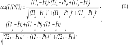 The values of the angles can be calculated using the vector dot product formula (similar to formula 5), for the angle T1PtT2 it will look like this:
