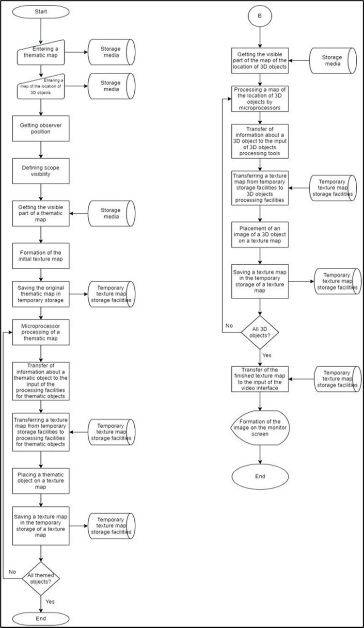 The essence of the algorithm is that in real time they preliminarily compose a thematic map (a map of the location of thematic objects on the texture), form and store thematic data (various texture samples) and compose a texture map from thematic objects. A texture map is a set of thematic objects that can be modified in real time, such as resizing, positioning, and masking. Topic data refers to a texture sample. Texture generation in real time is based on a new principle of approximation of the border of the docking" of thematic data when compiling a texture map: the formation of thematic objects from thematic data and the generation of a texture map from thematic objects is carried out by means of a mask overlay operation. In other words, the boundaries of "joining" of thematic data when compiling a texture map are "laid" in the form of a thematic object. At the same time, there is no need to use the rules of "docking" to approximate the border of "docking" of thematic data and change the parameters of all thematic elements when changing the size or position of a thematic map section and provides the possibility of overlapping several thematic objects.The algorithm in Figure 9 allows you to generate a realistic texture in real time, regardless of its complexity, the number of objects and possible changes in the parameters of objects (shape, size, position).