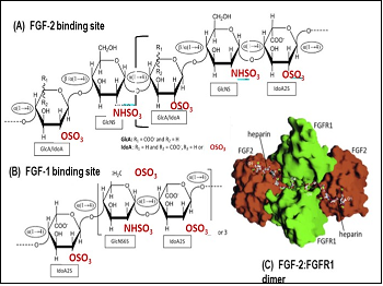 Figure 6.The (A) FGF-2 and (B) FGF-1 binding sites. Structural representations of Heparin (Hp) and Heparan sulfate (HS) and their binding motifs proposed for (A) FGF-2 and (B) FGF-1. (A) The FGF-2 binding site is proposed as the following pentasaccharide structure →4). (B) The FGF-1-binding site is proposed as the following pentasaccharide/heptasaccharide structure→4)-L-IdoA2S-α(1→4)-D-GlcNS6S-α(1 → 4)-L-IdoA2S-α(1→]. (C) Molecular model of FGF-2-FGFR1-Hp-tetrasaccharide [Pellegrini et al (2000); Schlessinger et al (2000)]. The model shows the surface of FGF-2, the D2 domain and the Hp tetrasacchride (stick model). O1 and O4 indicates the reducing and non-reducing ends and the 2:2;2 molecular ratio of the complex components The Hp ligands bind symmetrically on the canyon formed by the complex FGFR1 dimer-FGF-2-dimer In all panels the glycosidic bonds are indicated in ellipses whereas monosaccharide types are indicated in rectangles. Sulfation is highlighted in cyan. (This Figure is a modification of Figure 1B and 1C in Pomin VH Biochemie 127, 214-226 (2016) and Figure 4 in Schlessinger, J et al. Molecular Cell 6, 743-750 (2000) with permission from the publisher.![The (A) FGF-2 and (B) FGF-1 binding sites. Structural representations of Heparin (Hp) and Heparan sulfate (HS) and their binding motifs proposed for (A) FGF-2 and (B) FGF-1. (A) The FGF-2 binding site is proposed as the following pentasaccharide structure →4). (B) The FGF-1-binding site is proposed as the following pentasaccharide/heptasaccharide structure→4)-L-IdoA2S-α(1→4)-D-GlcNS6S-α(1 → 4)-L-IdoA2S-α(1→]. (C) Molecular model of FGF-2-FGFR1-Hp-tetrasaccharide [Pellegrini et al (2000); Schlessinger et al (2000)]. The model shows the surface of FGF-2, the D2 domain and the Hp tetrasacchride (stick model). O1 and O4 indicates the reducing and non-reducing ends and the 2:2;2 molecular ratio of the complex components The Hp ligands bind symmetrically on the canyon formed by the complex FGFR1 dimer-FGF-2-dimer In all panels the glycosidic bonds are indicated in ellipses whereas monosaccharide types are indicated in rectangles. Sulfation is highlighted in cyan. (This Figure is a modification of Figure 1B and 1C in Pomin VH Biochemie 127, 214-226 (2016) and Figure 4 in Schlessinger, J et al. Molecular Cell 6, 743-750 (2000) with permission from the publisher.](/article/1309/images/image6.png)