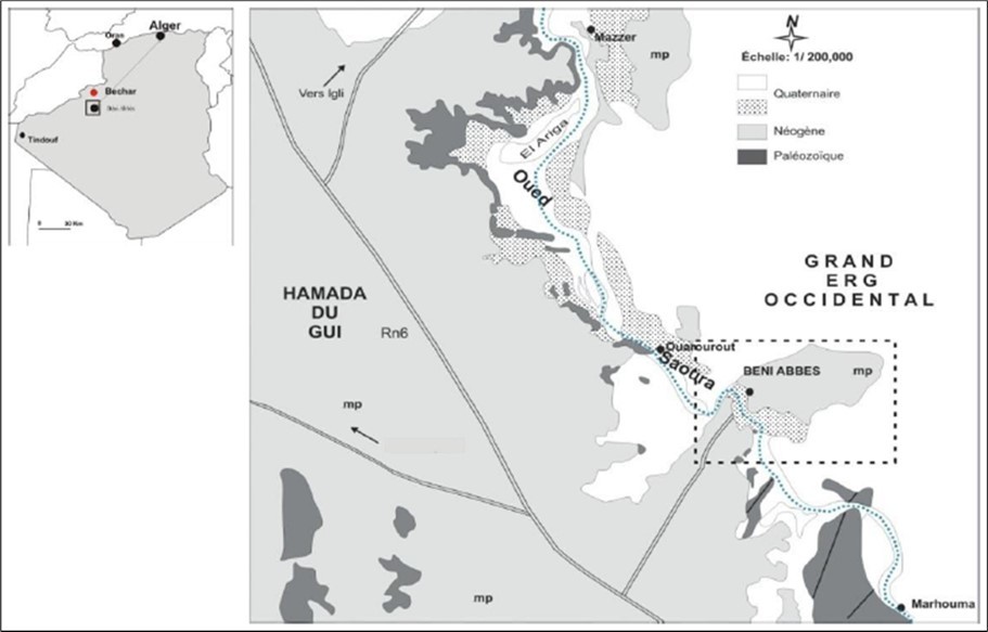 Béni Abbès appears as the capital of the Saoura Oasis. It is located about 240 kilometers southwest of Béchar and 880 kilometers southwest of Algiers (Figure 8). The Saoura Valley, resulting from the junction of the Guir and Zouzfana wadis, represents the main watercourse of the North Western Sahara of Algeria. It is bordered to the east by the Grand Erg Occidental, and to the west by the Hamada du Guir and the small Hamada.
